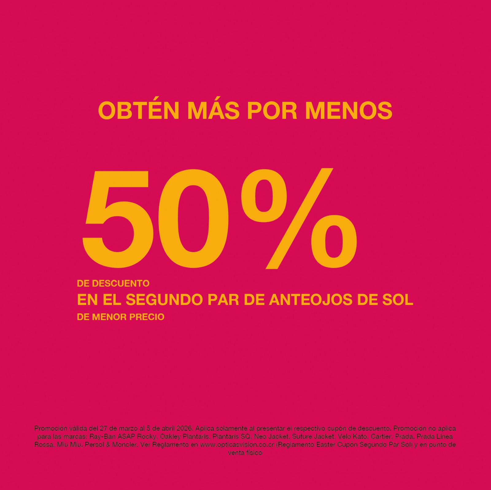 Obtenga un 50% de descuento sobre precio regular en la compra de la segunda unidad “ARO CON LENTES + ANTEOJO DE SOL”, “ARO CON LENTES + ARO CON LENTES”, “ANTEOJOS DE SOL + ANTEOJOS DE SOL”. Descuento válido para producto de menor valor. Descuento no aplica en líquidos y/o accesorios. Descuento no acumulable con otras promociones y/o descuentos. Descuento vigente por 15 días para hacer efectivo el canje del cupón. Promoción válida del 11 de abril al 20 de abril del 2025 en tiendas físicas y www.opticasvision.co.cr
