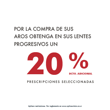 Obtenga un 20% de descuento sobre precio regular en la compra de sus primeros Lentes Progresivos, al adquirir un par completo (aros + lentes progresivos). Descuento válido para producto de menor valor. Descuento no aplica en líquidos y/o accesorios. Se excluyen los lentes Eyezen. Descuento no acumulable con otras promociones y/o descuentos. Promoción válida del 02 de enero al 30 de abril 2026 en tiendas físicas y www.opticasvision.co.cr