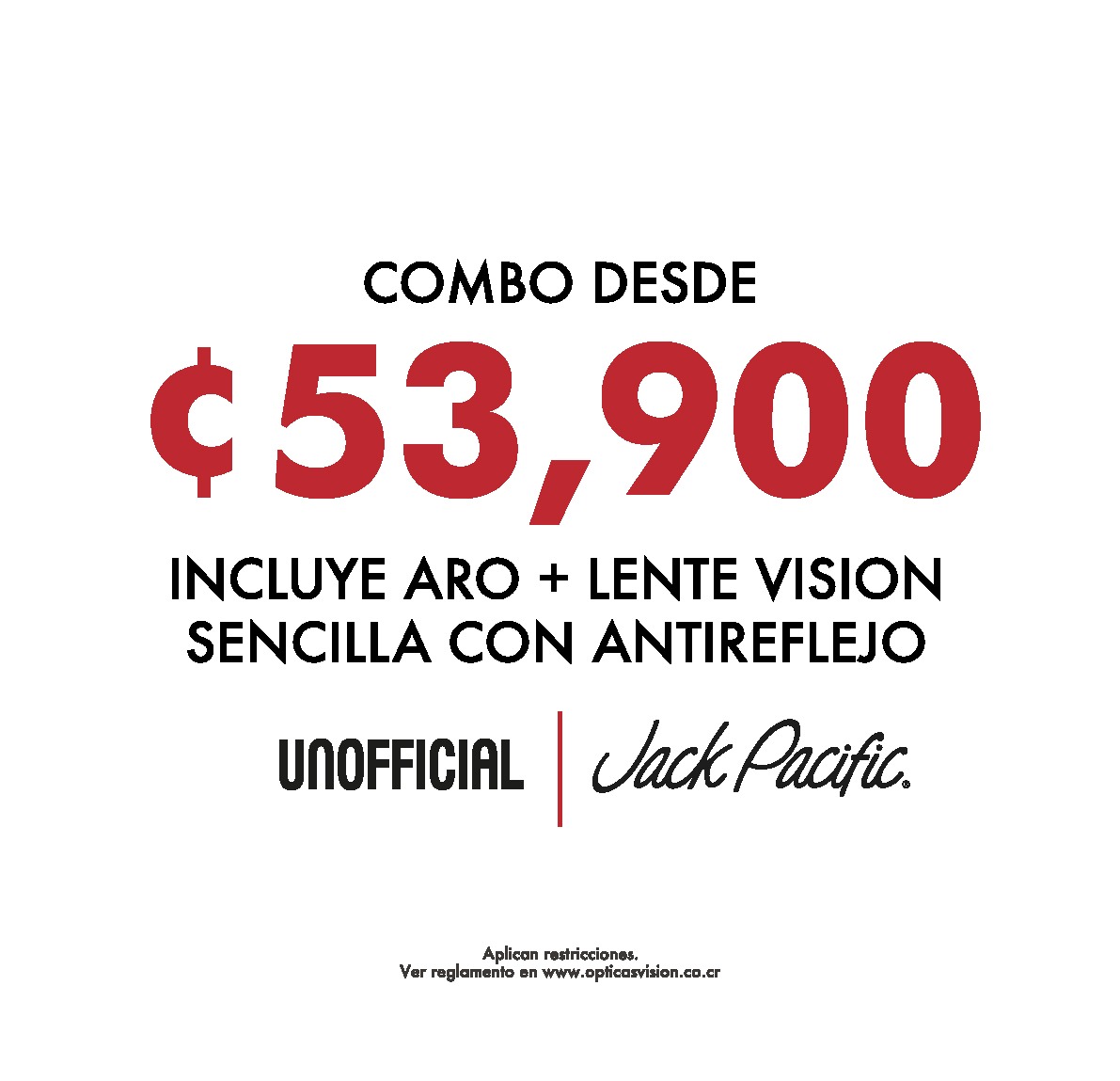 Adquiera un paquete completo de ARO MARCA UNOFFICIAL O JACK + LENTES GRADUADOS + EXAMEN DE LA VISTA + ESTUCHE + FRANELA según su necesidad, en las siguientes combinaciones. Visión Sencilla | Rango medida: Esf.-25/+20|Cyl.-6. Visión Sencilla Plástico Transparente + Antirreflejo Premium | Precio Combo: 53.900. Visión Sencilla Policarbonato Blue + Antirreflejo Premium | Precio Combo: 73.900. Visión Sencilla Policarbonato Blue + Antirreflejo Crizal Sapphire |Precio Combo: 118.900. Visión Sencilla Policarbonato Transition Gris + Antirreflejo Crizal Sapphire |Precio Combo: 162.900. Bifocales | Rango medida: Esf.-6/+8|Cyl.-6| add 3. Bifocal Kriptok Plástico Blanco | Precio Combo: 47.900 Bifocal Kriptok Plástico Fotocromático Gris | Precio Combo: 87.900 Progresivos | Rango medida: Esf.-7/+7|Cyl.-6| add 3 Progresivo Adaptar Plástico Transparente | Precio Combo: 67.900 Progresivo Clear Vision Policarbonato Blue + Antirreflejo Premium | Precio Combo: 107.900 Progresivo Transition| Rango medida: Esf.-10/+6|Cyl.-6| add 3. Progresivo Clear Vision Policarbonato Transition Gris + Antirreflejo Premium | Precio Combo: 147.900 Beneficio no acumulable con otras promociones, convenios y/o descuentos. Beneficio exclusivo únicamente con la marca UNOFFICIAL O JACK. Precio por paquete incluye IVA. Promoción válida HASTA DICIEMBRE 2026 en tiendas físicas.