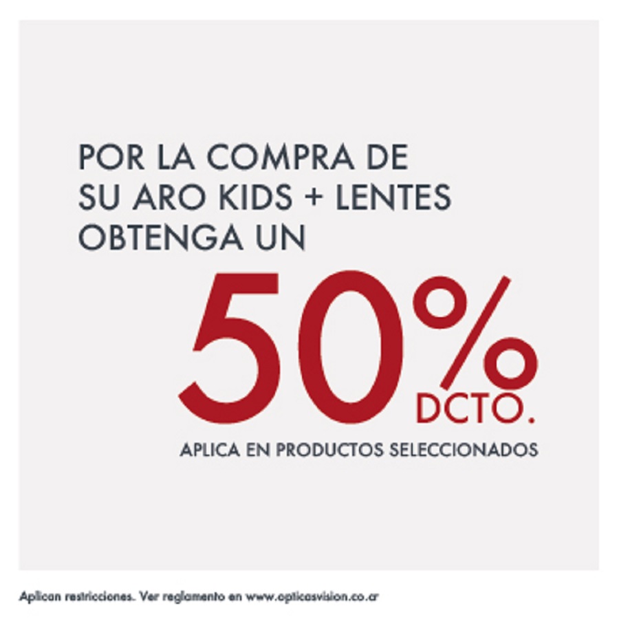 Por la compra de tu aro kids + lentes obtenga un 50% (productos seleccionados). Del 02 de enero al 31 de diciembre de 2026 Obtenga un 50% de descuento en aros KIDS seleccionados. Descuento aplica en la combinacion aro + lentes, no aplica en venta de aro solo.  Descuento no acumulable con otras promociones y/o descuentos. Promoción válida del 2 Enero  al 31 de diciembre del 2026 en tiendas, ver reglamento y www.opticasvision.co.cr