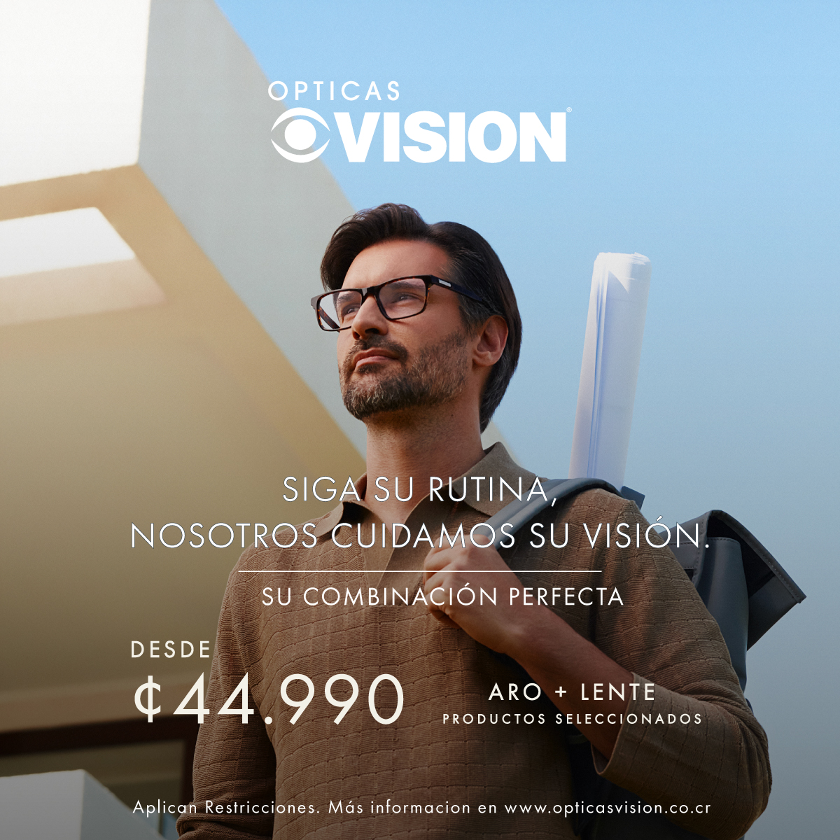 Obtenga hasta un 50% de descuento sobre precio regular en la compra de AROS Y/O ANTEOJOS DE SOL. Promoción no aplica en las marcas Prada, Prada Rossa, Cartier y Persol. Descuento válido para producto de menor valor. Descuento no aplica en líquidos y/o accesorios. Descuento no acumulable con otras promociones y/o descuentos. Promoción válida del 25 de junio al 30 de setiembre del 2025 en tiendas físicas y www.opticasvision.co.cr